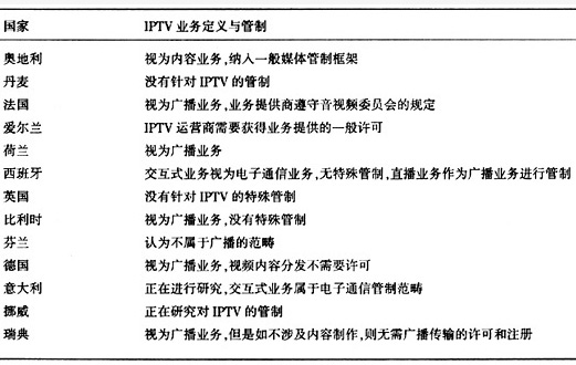管制環(huán)境對(duì)IPTV的影響是根本性的。這種根本性主要體現(xiàn)在IPTV的準(zhǔn)入和業(yè)務(wù)劃分上,前者決定電信公司是否能夠經(jīng)營IPTV,后者則決定IPTV應(yīng)如何管理。