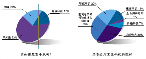 根據(jù)調查結果,目前國內(nèi)知道黑莓手機的消費者僅占20%,有63%的消費者從沒有聽說過“黑莓”這個名字,還有17%的消費者只是有點印象。