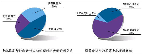 而根據(jù)調查結果,國內(nèi)消費者對于黑莓手機市場售價的普遍接受范圍在2500元以下。有63%的消費者認為黑莓手機應該在1500-2500元,30%的消費者認為可以在1000元到1500元之間,只有7%的人認為黑莓手機售價應當超過2500元。