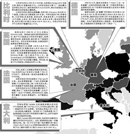 對(duì)于歐洲觀眾來說,IPTV(網(wǎng)絡(luò)付費(fèi)電視)就是他們未來的生活主畫面之一。他們只需每月交付30歐元(約合人民幣309元)到60歐元(約合人民幣618元)的費(fèi)用,便可在電視或電腦上選擇收看上百個(gè)頻道的電視節(jié)目。歐洲雖然缺乏強(qiáng)大的衛(wèi)星網(wǎng)絡(luò)作為技術(shù)支持,不過卻擁有多家實(shí)力雄厚的電信營(yíng)運(yùn)商,這些巨頭們擁有相同的興趣和市場(chǎng),正考慮是否聯(lián)合經(jīng)營(yíng),共同分食歐洲網(wǎng)絡(luò)電話電視市場(chǎng)這塊“大蛋糕”。