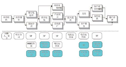 目前運(yùn)營商涉及的鏈條有寬帶接入提供、內(nèi)容存儲(chǔ)分發(fā)、產(chǎn)品展示、營銷推廣、支付、客戶服務(wù)等。