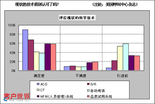 這是調(diào)查美國(guó)客服中心的管理者們?nèi)绾卧u(píng)價(jià)自己公司引進(jìn)技術(shù)的統(tǒng)計(jì)表。雖然“滿意”并不意味著“相關(guān)技術(shù)被有效利用”。可是從調(diào)查結(jié)果來(lái)看,他們對(duì)技術(shù)的滿意度相當(dāng)高,并且看起來(lái)都在有效利用相關(guān)技術(shù)。