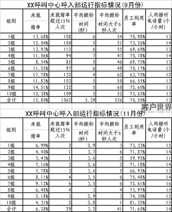 筆者所在呼叫中心從今年10月份開始實行“四率管理”,以解決現(xiàn)場管理工作的存在的問題,提高現(xiàn)場管理水平,提高服務效率。從統(tǒng)計數(shù)據(jù)看(見下表),實行“四率管理”后,呼叫中心的現(xiàn)場管理水平得到大幅提高,服務指標增長較快。在員工利用率基本保持不變的情況下,未就緒率、平均振鈴時間、每小時接聽電話量等指標均得到有效改善。其中,未就緒率從9月份的12.8%降低到6.3%,未就緒率低于15%的員工人次從1062次降低到29次;平均振鈴時間從5.4秒降低到3.2秒,平均振鈴時間大于6秒的人次從526人次降低到41人次。每小時人均接聽電話數(shù)量從13個提高到14個。按8小時工作計算,每人每天接聽電話數(shù)量增長10個左右。具體統(tǒng)計數(shù)據(jù)見下表。