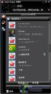 而Lava-Lava更是將整合功能發(fā)揮得淋漓盡致。上了Lava-Lava,還得惦記著MSN和雅虎通的好友,都登錄吧,不僅占用內存資源還嫌麻煩,現(xiàn)在不用再發(fā)愁了,新版lava不僅已經(jīng)集成了MSN好友分組,還可以與雅虎通的好友互通,以后能在lava-lava上直接與MSN或雅虎通好友交流了。操作方法相當簡單,在你的主界面,添加MSN和雅虎通好友分組即可(圖14)。