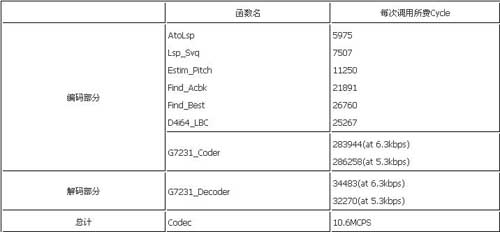 經(jīng)過C語言級(jí)和匯編級(jí)的多種優(yōu)化,最后實(shí)現(xiàn)了一路G.723.1的編解碼需要花費(fèi)10.6MCPS,整個(gè)代碼的程序空間為208K byte(程序中包括了部分c6201的庫函數(shù)),數(shù)據(jù)空間為8K byte,碼本大小20k byte,多通道的上下文數(shù)據(jù)為1.48K byte。200MHz的C6201每秒可以實(shí)時(shí)編解碼16路語音信號(hào)。所有代碼全部通過了ITU-T測(cè)試矢量的測(cè)試。表1是各主要模塊的運(yùn)算量。