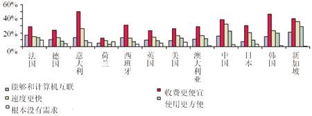 手機(jī)上網(wǎng)也受到一些用戶的歡迎,這得益于一些運(yùn)營(yíng)商為促進(jìn)移動(dòng)互聯(lián)網(wǎng)的推廣而越來越多地采取了手機(jī)上網(wǎng)打包套餐。此外,不同地區(qū)的用戶對(duì)使用手機(jī)上網(wǎng)的偏好不同,調(diào)查顯示,亞洲國(guó)家用戶使用手機(jī)上網(wǎng)的比例高于歐洲國(guó)家用戶。其中,日本的被調(diào)查者通過手機(jī)上網(wǎng)的比例明顯超過平均水平,這離不開NTTDoCoMo公司i-Mode的成功。有意思的是,中國(guó)緊隨日本排名第二,這有可能是因?yàn)橐苿?dòng)通信在中國(guó)的普及率并不高,目前的用戶對(duì)技術(shù)的領(lǐng)悟能力大大超過了其它國(guó)家的平均水平,也有可能是因?yàn)橐恍┍徽{(diào)查者用手機(jī)替代了固定電話,手機(jī)成為其上網(wǎng)的惟一途徑(見圖3)。展望未來,Ovum認(rèn)為該領(lǐng)域充滿了期待。