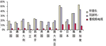 除打電話、發(fā)短信、拍照、手機(jī)郵箱以外,音樂、游戲也是用戶每周使用較多的業(yè)務(wù)。當(dāng)被問及其它應(yīng)用時(shí),來自中國(guó)、新加坡還有韓國(guó)的部分被調(diào)查者表示,他們會(huì)經(jīng)常用手機(jī)來聽音樂和玩游戲。其中,中國(guó)是惟一一個(gè)選擇用手機(jī)聽音樂的用戶數(shù)與選擇用手機(jī)拍照的用戶數(shù)旗鼓相當(dāng)?shù)膰?guó)家。但有趣的是,手機(jī)在中國(guó)不太可能成為MP3的替代品,仍然只是一個(gè)便攜播放器。在新加坡,手機(jī)替代MP3的可能性就大多了。Ovum認(rèn)為,這是由于高端手機(jī)在新加坡市場(chǎng)占有很高的比例。在歐洲和美國(guó),使用手機(jī)來聽音樂和玩游戲的比例則比亞洲少了很多,但值得鼓勵(lì)的是仍有超過10%的被調(diào)查者選擇了該答案。(見圖2)