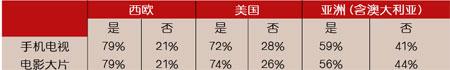 Ovum還詢問了被調(diào)查者對(duì)于手機(jī)電視和電影大片的看法,對(duì)于這兩項(xiàng)業(yè)務(wù),正面積極的回應(yīng)率很低,很少有人愿意支付額外費(fèi)用來購(gòu)買手機(jī)電視或是精彩大片,但是也有被調(diào)查者表示愿意接受廣告以換取免費(fèi)的電視和電影內(nèi)容。