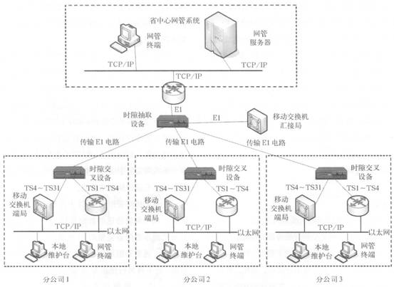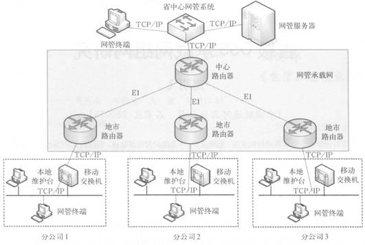 同樣以移動網(wǎng)為例,例子中移動交換機(jī)到維護(hù)終端支持TCP/IP方式,分公司具有本地維護(hù)終端和網(wǎng)管終端兩種類型的維護(hù)臺。本地維護(hù)終端通過以太交換機(jī)直接與移動交換機(jī)相連;網(wǎng)元和網(wǎng)管終端通過以太網(wǎng)接入邊緣路由器,經(jīng)路由器接.el轉(zhuǎn)化以El方式接入到時隙抽取設(shè)備中,由于傳送網(wǎng)管信息占用帶寬較小,
