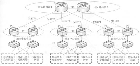 在地市分公司的中心節(jié)點配置兩臺中端PE路由器和兩臺以太網(wǎng)交換機(jī),負(fù)責(zé)各個業(yè)務(wù)網(wǎng)元、終端的規(guī)范接入,通過在交換機(jī)上劃分不同的VLAN對各個業(yè)務(wù)系統(tǒng)進(jìn)行隔離,各業(yè)務(wù)接入到各自的VPN中。PE