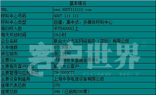 2007年秋天,聯(lián)合大眾汽車(chē)網(wǎng)絡(luò)服務(wù)(深圳)有限公司現(xiàn)代化、智能化的大型全國(guó)電話呼叫中心落成并投入使用。從投入使用至今,呼叫中心經(jīng)歷了從無(wú)到有、不完善到健全的發(fā)展歷程,聯(lián)合大眾24小時(shí)全國(guó)服務(wù)熱線現(xiàn)已成為客戶(hù)價(jià)值與公司價(jià)值之間傳遞的橋梁。