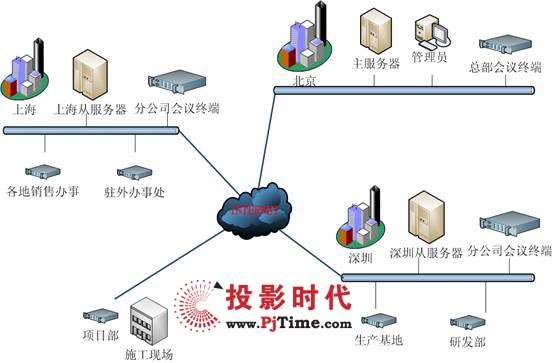 3臺高端專用服務(wù)器作為視頻會議服務(wù)器,可容納多點同時開會,以確保系統(tǒng)的穩(wěn)定性和性能要求。主服務(wù)器放置在總公司,從服務(wù)器共2個,分別放置在輻射分公司面大,位于分公司中心的兩個城市。所有接入的服務(wù)器和客戶端采用同一網(wǎng)絡(luò)服務(wù)商的線路。配置了使用1000M服務(wù)器專用網(wǎng)卡,以保證正常的音視頻信號的傳輸。并且將服務(wù)器放置在主干/核心交換機上,使服務(wù)器和客戶端的路由/交換性能達到最佳效果。其網(wǎng)絡(luò)拓撲圖如下: