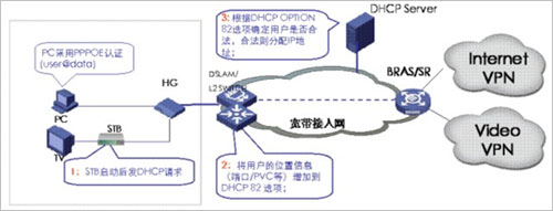 當(dāng)網(wǎng)絡(luò)設(shè)備收到STB的DHCP請(qǐng)求報(bào)文時(shí),需要在報(bào)文后添加OPTION82字段,此時(shí)有兩種模式進(jìn)行DHCP+認(rèn)證,一種是直接把DHCP報(bào)文送給DHCP服務(wù)器,由DHCP服務(wù)器根據(jù)OPT82字段來判斷該用戶是否為合法用戶,從而決定是否為其分配IP地址。另一種是DHCP報(bào)文先送到BRAS,由BRAS將OPT82字段放到RADIUS的一個(gè)子域里,通過RADIUS服務(wù)器來進(jìn)行用戶合法性認(rèn)證,若用戶合法,再由DHCP服務(wù)器分配IP地址。