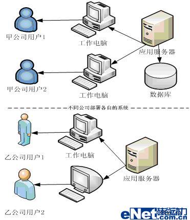 傳統(tǒng)軟件是在公司內(nèi)部架設(shè)軟件運(yùn)行環(huán)境,自己購買應(yīng)用服務(wù)器、數(shù)據(jù)庫服務(wù)器、網(wǎng)卡等硬件,安裝自己的局域網(wǎng)并在局域網(wǎng)內(nèi)部署軟件。所以不同公司都各自部署一套自己的系統(tǒng)。不同公司的用戶事實(shí)是通過不同的途徑訪問不同的系統(tǒng),如圖2所示: