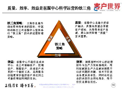 應(yīng)該說這三個方面是科學(xué)運營的一個鐵三角,這是我們的理解,因為三角形,始終認(rèn)為是最穩(wěn)定、簡單、有效的圖形,也是我們在進行內(nèi)部運營的管理鐵架。質(zhì)量是客服中心最大的觸點當(dāng)中被客戶感知,從而帶來客戶忠誠的,如何管理質(zhì)量,那就至關(guān)重要。效率尤其是規(guī)模型的呼叫中心的運營好壞,是與生產(chǎn)力的發(fā)展強相關(guān),而科技解放生產(chǎn)力是解決規(guī)模問題的關(guān)鍵。技術(shù)不僅是運行更具效益率,同時還對企業(yè)的決策作出預(yù)先準(zhǔn)備,而不僅僅是事后反應(yīng)。很多年來,更多的企業(yè)是把客服中心視為成本中心,而事實上,效益的顯現(xiàn)讓我們陸續(xù)地走出了成本中心,它應(yīng)該是公司接觸客戶、挖掘客戶、挽留客戶、改進客戶關(guān)系的一個最好工具,是用服務(wù)創(chuàng)造更有價值的客戶,來達到公司最終增加利潤的目標(biāo)。