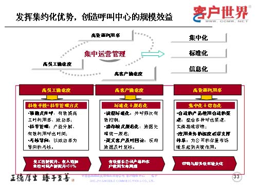 作為集中管理來講,突出“三高”,運用好“三高”體現(xiàn)的是如何進行集中化、標(biāo)準(zhǔn)化和信息化。我們從高員工滿意度,高客戶滿意度和高資源利用率入手,高員工滿意度主要是應(yīng)用平臺和科學(xué)的管理方法,使得員工的技能持續(xù)提升,員工的自身收入也按單位時間而增長;高客戶滿意度是用標(biāo)準(zhǔn)化和規(guī)范化來進一步優(yōu)化流程,改進操作,對于目標(biāo)客戶及時回訪,有效地延長公司產(chǎn)品的客戶使用生命周期,以創(chuàng)造公司的最大利益;作為集中化的呼叫中心,系統(tǒng)已經(jīng)投入了較大的座席規(guī)模,高資源利用率是如何把這些座席和系統(tǒng)的規(guī)模應(yīng)用得更好,使得我們的產(chǎn)品能夠進一步地推向市場,被客戶所接受,所以我們采取了更多的整合呼出渠道,精確營銷,尤其對公司的存量客戶進行持續(xù)維系的關(guān)鍵時刻,達到營銷與服務(wù)效率的最大化。
