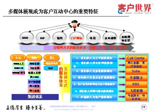 世界上卓越的企業(yè)無所不在,在客戶戰(zhàn)略上最具創(chuàng)新能力的企業(yè),奠定起的競爭,也會越來越出體現(xiàn)在客戶關(guān)系管理上,隨著數(shù)據(jù)業(yè)務(wù)成為運營商的主流業(yè)務(wù),呼叫中心在服務(wù)、營銷、渠道管理等方面的戰(zhàn)略地位會日益重要,隨著客戶接觸的不斷增長,呼叫中心將逐漸演變成客戶接觸中心、互動中心,乃至包括實體渠道之外的各種電子渠道,任重而道遠。
