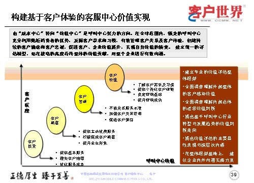 從客戶接受到客戶滿意、客戶忠誠和客戶價值提升,建立統(tǒng)一的評估模型,站在戰(zhàn)略的高度來看待整體的客服中心價值貢獻,對企業(yè)進行有效的溝通。這就是說我們建立的是專業(yè)的價值評估整體框架,全面調(diào)查、理解外部的客戶感知價值,全面調(diào)查理解內(nèi)部的運營價值來判斷,提出基于呼叫中心行業(yè)轉(zhuǎn)型與發(fā)展趨勢的價值判斷走向,提升價值評估的主要顯性表現(xiàn)與深層次內(nèi)涵,在整體框架基礎(chǔ)上,建立企業(yè)內(nèi)外溝通的實施方案。