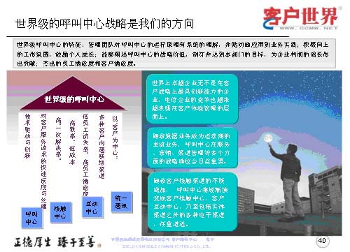 最后我想世界級的呼叫中心戰(zhàn)略是我們從事客戶服務(wù)行業(yè),從事呼叫中心人的方向,從我們理解的世界級呼叫中心特征來講,管理團隊?wèi)?yīng)對呼叫中心的運營原理有系統(tǒng)的理解,并貼切地應(yīng)用到業(yè)務(wù)實踐,創(chuàng)造積極向上的工作氛圍,鼓勵員工成長,能夠闡述呼叫中心的戰(zhàn)略價值,制訂并達到本部門的目標(biāo),為企業(yè)利潤的增長作出杰出的貢獻,杰出的員工滿意度和客戶滿意度。所以世界級呼叫中心我們理解是從七個方面來衡量,以“客戶為中心”,多種客戶溝通的聯(lián)絡(luò)渠道,低員工流失率和高客戶滿意度,高效率、低成本,高“一次性解決率”,對客戶服務(wù)請求的快速反應(yīng)與處理,技術(shù)驅(qū)動與創(chuàng)新。