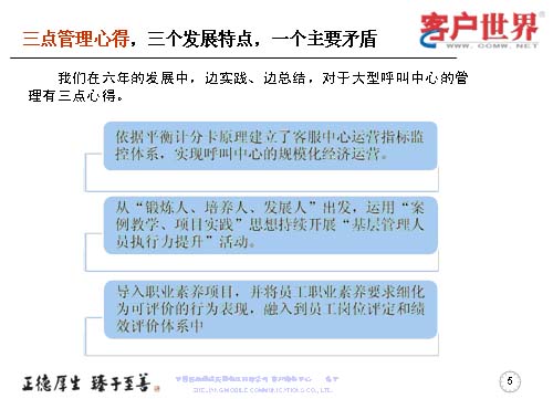 在這六年中,我們有三點管理心得,三個發(fā)展特點,一個主要矛盾。我們邊實踐邊總結(jié),對大型呼叫中心運營的管理有三點心得: