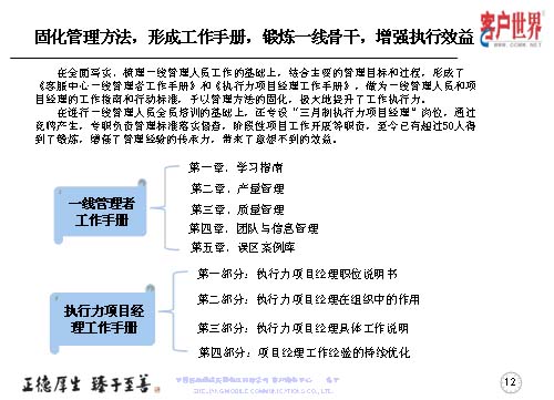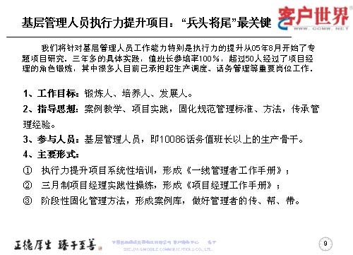 大家知道基層管理人員其實是兵頭將尾的最關(guān)鍵,我們將對基層管理人員的工作能力,特別是執(zhí)行力的提升是從05年8月份就開始了專項研究,三年多的具體實踐,值班長的培訓(xùn)率達到100%,超過50人經(jīng)過了項目經(jīng)理的角色鍛煉,目前很多擔(dān)任過項目經(jīng)理的已經(jīng)承擔(dān)了生產(chǎn)調(diào)度、話務(wù)管理等重要的管理崗位。在這個項目當(dāng)中,我們從四個方面入手,工作目標(biāo)是鍛煉人、培養(yǎng)人、發(fā)展人。指導(dǎo)思想是案例教育、項目實踐,固化規(guī)范管理標(biāo)準(zhǔn)、方法,傳承管理經(jīng)驗。參與人員就是基層管理人員,話務(wù)值班長以上的生產(chǎn)骨干。我們主要運用的形式是執(zhí)行力提升項目系統(tǒng)培訓(xùn),形成了《一線管理者工作手冊》。三月制項目經(jīng)理的實踐操練,通過競聘的方式產(chǎn)生,形成了《項目經(jīng)理工作手冊》。階段性的固化-優(yōu)化-再固化的管理方法,形成案例庫,做好管理者的傳幫帶。