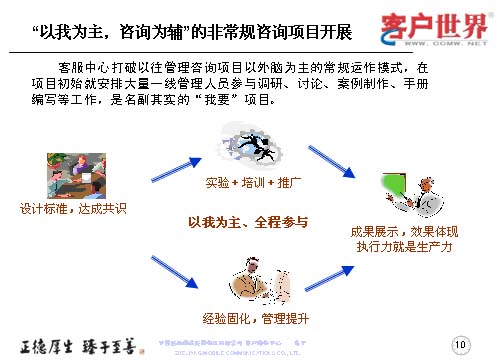 這個管理咨詢項目開展中,是以我為主,咨詢?yōu)檩o的非常規(guī)咨詢項目,打破的是以外腦為主的常規(guī)運作模式,在項目初期就有大量的一線管理人員參與調(diào)研、討論、案例制作、手冊編制,是名副其實的“我要”項目。那么在這個方面我們分成了三部曲,設(shè)計標(biāo)準(zhǔn)、達成共識,通過實驗加培訓(xùn)推廣,以我為主的全程參與,來固化經(jīng)驗,提升管理。最后成果展示,效果體現(xiàn)于執(zhí)行力,彰顯出生產(chǎn)力。