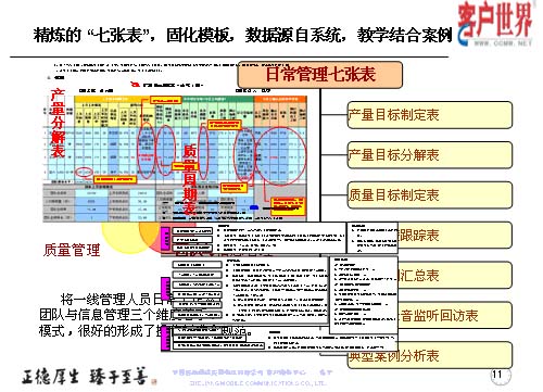 我們精煉了這么七張表的方式,運用三個維度:產(chǎn)量管理、質(zhì)量管理和團隊與信息管理,而這些基礎(chǔ)數(shù)據(jù)都來自于系統(tǒng),教學(xué)和案例。而七張表是從產(chǎn)量、質(zhì)量和團隊信息來展現(xiàn)出具體的一些應(yīng)用,將一線管理人員從日常工作的三個維度入手,形成七張表管理模式,很好地具備了操作標(biāo)準(zhǔn)和規(guī)范。這模板表除了系統(tǒng)出來的一些數(shù)據(jù)以外,通過我們基層管理人員的項目執(zhí)行和跟蹤檢查,形成一些案例,改進計劃和改進意見。這幾張表多為系統(tǒng)自身所產(chǎn)生一些具體的數(shù)據(jù),比如說上個月的指標(biāo)值如何設(shè)定,實際達成的產(chǎn)量怎樣,回訪滿意率具體有哪些數(shù)據(jù),都在客服系統(tǒng)的報表中提煉出來的相關(guān)數(shù)據(jù)。