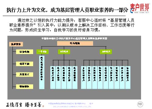 在執(zhí)行力上升文化的同時,基層管理者的職業(yè)素養(yǎng)是我們時刻去追求的,所以客服中心適時地將基層管理人員的職業(yè)素養(yǎng)引入到其中,以期從根本上解決工作目標(biāo)、工作態(tài)度等問題,形成終生學(xué)習(xí),自我學(xué)習(xí)的良好修身習(xí)慣。這是我們客服中心基層管理人員職業(yè)素養(yǎng)的一個體系圖,首先從素養(yǎng)要求的四個維度,行為準(zhǔn)則的一、五、九來展現(xiàn)。一個目標(biāo)是成為優(yōu)秀的管理者,五個注重是注重客戶需求、注重工作細節(jié)、注重團隊建設(shè)、注重總結(jié)匯報、注重制度落實。九種能力:目標(biāo)計劃能力,貫徹執(zhí)行能力、分析解決能力、協(xié)調(diào)溝通能力、總結(jié)創(chuàng)新能力、時間管理能力、師人育人能力和標(biāo)桿超越能力。這個一、五、九,讓它彰顯出素養(yǎng)和表現(xiàn)的四個維度,以身作則、培育下屬、關(guān)愛員工和鍛造團隊。