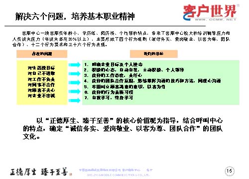 一線客服人員如何來全面提升職業(yè)能力,首先是解決一線客服人員的六個問題,剛才已經(jīng)跟大家交流了客服中心一線人員的人員結(jié)構(gòu),當(dāng)前的六個主要問題可以用簡單的幾個方面來表述:對生活沒有明確的目標(biāo)、對自己不進取、對工作不負(fù)責(zé)、對同事不合作、對顧客不關(guān)心、對企業(yè)不忠誠,這是在日常工作中,一線人員所存在的問題。而針對這些問題,我們要用工作目標(biāo)去持續(xù)解決和克服問題,所以我們采取的是讓大家明確企業(yè)目標(biāo)與個人使命,用積極的心態(tài)自主自發(fā),主動積極和個人領(lǐng)導(dǎo);良好的工作態(tài)度責(zé)任心,良好的團隊合作氛圍;熟練掌握溝通技巧和方法,牢固樹立顧客滿意的意識,以客為尊;良好的行為素質(zhì)習(xí)慣,自我學(xué)習(xí),終身學(xué)習(xí)。從而在中國移動集團“正德厚生、臻于至善”的核心價值觀指導(dǎo)下,結(jié)合呼叫中心特點,確定誠實務(wù)信,愛崗敬業(yè),以客為尊、團隊合作的團隊文化。