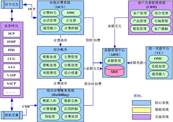 在線計(jì)費(fèi)系統(tǒng)通過實(shí)時(shí)信令交互實(shí)現(xiàn)對(duì)高風(fēng)險(xiǎn)和高價(jià)值業(yè)務(wù)的實(shí)時(shí)計(jì)費(fèi);綜合計(jì)費(fèi)帳務(wù)系統(tǒng)通過準(zhǔn)實(shí)時(shí)話單采集實(shí)現(xiàn)對(duì)后付費(fèi)用戶的準(zhǔn)實(shí)時(shí)計(jì)費(fèi);綜合帳務(wù)系統(tǒng)實(shí)現(xiàn)全業(yè)務(wù)的綜合優(yōu)惠和帳務(wù)處理;獨(dú)立的余額管理中心實(shí)現(xiàn)對(duì)電信余額的統(tǒng)一管理,未來將成為電信的“內(nèi)部銀行”;統(tǒng)一充值平臺(tái)實(shí)現(xiàn)全網(wǎng)全業(yè)務(wù)的統(tǒng)一充值支付。