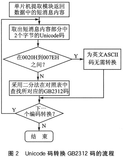 單片機通過串口與模塊連接后,發(fā)送讀取第一條新短消息指令:“AT+CMGR=1”。提取模塊接收的短消息后,先判斷其內(nèi)容是否為ASCII碼。若為ASCII碼,則無需轉(zhuǎn)換直接讀;否則,通過查表法查找其對應(yīng)的漢字GB碼,實現(xiàn)不同編碼間的轉(zhuǎn)換。轉(zhuǎn)換流程如圖2所示。
