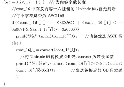 經(jīng)研究比較發(fā)現(xiàn),所要提取的短信信息包括手機號碼、時間和短信內(nèi)容。在Text模式下時間和日期均為ASCII碼,可直接讀取,只需將內(nèi)容中漢字部分的Unicode碼轉(zhuǎn)換成國標(biāo)碼;而在PDU模式下除漢字編碼轉(zhuǎn)換外,還需將號碼、時間部分編碼進行兩兩顛倒的轉(zhuǎn)換,才能得到所需的正確信息。故在系統(tǒng)設(shè)計中將GSM模塊設(shè)為Text模式,更能簡化程序設(shè)計。