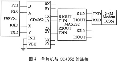 CD4052實際上是2個一分四的數(shù)據(jù)分配器,所擴展的串口均是全雙工異步工作模式,具有很高的工作速度,方便地實現(xiàn)了一片單片機多個串口的擴展能力。以Siemens公司的TC35i GSM模塊為編程對象,通過P89 V51單片機進行控制,構(gòu)建了實際系統(tǒng),實現(xiàn)了編程過程以及系統(tǒng)串口擴展等,有效地接收并完成中文短消息代碼的轉(zhuǎn)換,驗證了上述構(gòu)建思路的可行性和正確性。