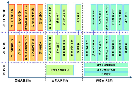 從系統(tǒng)的部署來看,主要集中在集團與省公司,其中,集團公司系統(tǒng)主要具備面向全公司的企業(yè)管理、經(jīng)營分析等功能;省公司從以職能管理為主逐步轉(zhuǎn)變?yōu)橐陨a(chǎn)管理為主,具有了越來越多的生產(chǎn)職能,在運營支撐系統(tǒng)建設中的作用更加突出;市公司的生產(chǎn)管理職能有所削弱,將主要負責市場的具體營銷、客戶支撐以及設備的現(xiàn)場維護等工作。現(xiàn)有系統(tǒng)主要存在以下幾個問題: