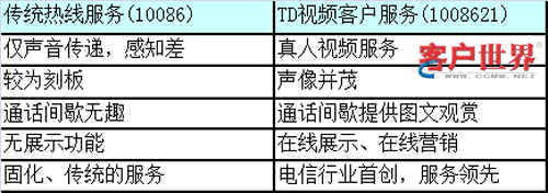 TD視頻客服與傳統(tǒng)語音熱線服務(wù)相比,最大區(qū)別在于可通過“面對(duì)面”方式向客戶提供相關(guān)服務(wù),具備“服務(wù)”和“體驗(yàn)”兩大特點(diǎn)。視頻客服在服務(wù)內(nèi)涵、內(nèi)容等方面有較大的深化與突破空間,是多媒體呼叫中心服務(wù)手段的一種有效形式之一。