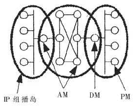 混合式組播的核心任務(wù)是為AM完成拓?fù)?包括數(shù)據(jù)拓?fù)浜涂刂仆負(fù)?的構(gòu)建。由于網(wǎng)絡(luò)狀況的動(dòng)態(tài)性,以及客戶端數(shù)量與客戶端加入系統(tǒng)時(shí)間的不確定性,當(dāng)前的應(yīng)用層組播方案一般需要每個(gè)結(jié)點(diǎn)定期與其他全部或一定比例的結(jié)點(diǎn)交換控制信息,以了解其他結(jié)點(diǎn)的狀態(tài),形成控制拓?fù)?保障數(shù)據(jù)拓?fù)涞慕研浴T诮Y(jié)點(diǎn)個(gè)數(shù)逐漸增加時(shí),網(wǎng)絡(luò)上的控制信息數(shù)量會(huì)占用大量的帶寬資源。應(yīng)用層組播的數(shù)據(jù)拓?fù)淇煞譃槎箢?信源樹和共享樹。信源樹必須為每個(gè)組播源保存路由信息,這樣會(huì)占用大量的系統(tǒng)資源。共享樹傳輸延時(shí)較大。IP視頻會(huì)議系統(tǒng)屬于實(shí)時(shí)交互應(yīng)用,視音頻數(shù)據(jù)占據(jù)很大的帶寬,并且對(duì)端到端傳輸延遲和網(wǎng)絡(luò)抖動(dòng)的要求很高,需要尋找一種既可以減少交換控制信息又可以保證視音頻數(shù)據(jù)實(shí)時(shí)傳輸?shù)耐負(fù)錁?gòu)建方式。為利用排列圖的優(yōu)越特性(如結(jié)點(diǎn)和邊的對(duì)稱性、故障恢復(fù)能力和容錯(cuò)能力、可以嵌入獨(dú)立的組播樹等),這里采用分層排列圖的結(jié)構(gòu)來組織混合式組播中的AM。