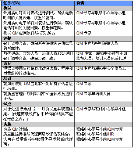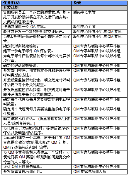 4. 開(kāi)展項(xiàng)目交流。管理人員必須就新的或者修繕后的QM計(jì)劃與代理商進(jìn)行交流。QM的成功與否與代理商的合作密不可分,如果代理商受邀參與新QM計(jì)劃的開(kāi)發(fā)并且所有改變都在雙方之間明確交流過(guò),那么成功的機(jī)會(huì)也將大大提高。交流的內(nèi)容應(yīng)包括為什么要開(kāi)發(fā)這樣一個(gè)計(jì)劃,它的作用和職責(zé)是什么,它對(duì)代理商會(huì)產(chǎn)生哪些影響(對(duì)于他們的評(píng)估和提升)以及它能帶來(lái)哪些好處。幫助代理商認(rèn)識(shí)到QM計(jì)劃積極的一面很重要,因?yàn)橹挥羞@樣才能讓他們看到QM不僅僅是管理人員用來(lái)告訴他們做錯(cuò)了事情的一種手段。讓聯(lián)絡(luò)中心全體員工參與QM計(jì)劃的開(kāi)發(fā)能夠建立他們對(duì)該計(jì)劃的支持,提高接受度的同時(shí)避免不知所措。這對(duì)聯(lián)絡(luò)中心剛剛嶄露頭角,QM計(jì)劃還未全面鋪開(kāi)的中國(guó)市場(chǎng)而言尤為重要。