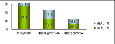 在3G設(shè)備市場方面,2008年,中國的WCDMA、CDMA2000與TD-SCDMA三種3G網(wǎng)絡(luò)在建設(shè)上有不同的進展。中國移動啟動了第二階段的TD-SCDMA網(wǎng)絡(luò)建設(shè)、中國電信啟動了涉及面向81個重點城市的CDMA全網(wǎng)招標、而中國聯(lián)通也開始7個城市建立WCDMA試驗網(wǎng)絡(luò)的建設(shè)工作。而在所有的網(wǎng)絡(luò)建設(shè)中,中國本土廠商借3G契機迅速提升競爭力,占據(jù)了3G網(wǎng)絡(luò)建設(shè)大部分市場份額。