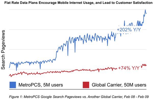 這里以美國(guó)一家地區(qū)性的小運(yùn)營(yíng)商MetroPCS為例,MetroPCS的CDMA用戶數(shù)剛超過(guò)500萬(wàn)。在過(guò)去的一年里,MetroPCS的Google搜索量增長(zhǎng)了2.5倍。而這個(gè)數(shù)字,是那些全球性的、擁有大量用戶和3G網(wǎng)絡(luò)運(yùn)營(yíng)商的10倍。