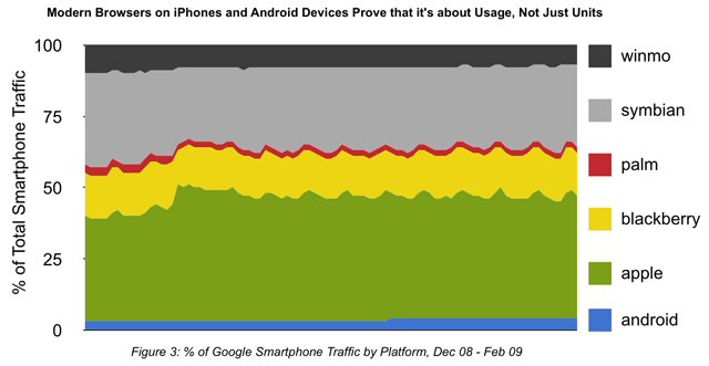 這里有個(gè)例子:iPhone、Android手機(jī)雖然僅占到智能手機(jī)市場(chǎng)份額的13%,卻貢獻(xiàn)了50%的智能手機(jī)Google搜索流量(Google訪問(wèn))。