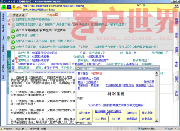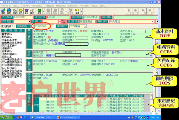 我們推動「CPEP客服流程提升計劃」的重點是在IVR流程中就請客戶自行輸入其欲查詢或辦理的電話號碼,同時客服系統(tǒng)便先透過EAI到后端信息系統(tǒng),查詢出該號碼的核心數(shù)據(jù)(含基本、帳務(wù)、欠費記錄、來電歷史等),當客服人員應(yīng)答時客服系統(tǒng)便立即將這些核心數(shù)據(jù)顯示在屏幕上(如圖一),客服人員便可立即掌握此客戶之相關(guān)資料,CPEP如此改善后平均的服務(wù)效率提升了11%。