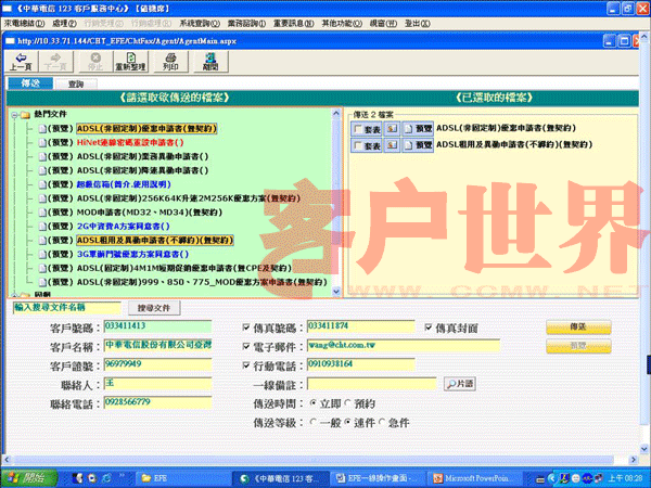 EFE第一步先將所有的窗口、文件與數(shù)據(jù)轉(zhuǎn)為電子化的檔案,當需要傳送書面文件給客戶時,客服人員可立即在在線點選以傳真或電子郵件將文件傳給客戶(如圖二),傳送成功后并立即以SMS通知客戶。當客戶反饋數(shù)據(jù)回來時,EFE會自動接收并存盤,接收成功后EFE則會立即發(fā)送SMS訊息給客戶安心,而且所有送出與接收文件都有完整記錄可共管理、追蹤與處理。