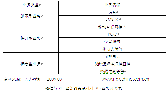 根據(jù)用戶對3G業(yè)務(wù)的體驗,其與2G業(yè)務(wù)的關(guān)系可以分為:繼承型業(yè)務(wù)(話音、SMS等)、提升型業(yè)務(wù)(移動互聯(lián)網(wǎng)接入、POC、位置服務(wù)、移動支付、整首歌曲下載等)、標(biāo)志型業(yè)務(wù)(可視電話、視頻流媒體點播直播、多媒體彩鈴、視頻會議等)