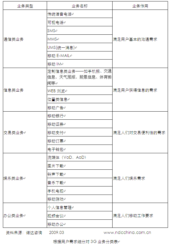 從個體用戶橫向需求角度對業(yè)務(wù)進(jìn)行劃分,3G業(yè)務(wù)可以分為五大類,主要包括五類通訊類業(yè)務(wù)、信息類業(yè)務(wù)、交易類業(yè)務(wù)、娛樂類業(yè)務(wù)、辦公類業(yè)務(wù)。諾達(dá)咨詢《3G發(fā)展報告系列——全球3G業(yè)務(wù)與運(yùn)營市場發(fā)展研究報告2009》認(rèn)為該種一方面考慮了企業(yè)業(yè)務(wù)發(fā)展相近性和規(guī)模效應(yīng),另一方面考慮的用戶的不同需求特性,把一個用戶多種需求分割開來,以實現(xiàn)低成本的使需求得以滿足。是一種傳統(tǒng)的業(yè)務(wù)分類方法,適合傳統(tǒng)技術(shù)條件下的合作分工的市場及產(chǎn)業(yè)環(huán)境。這種分類方法利于業(yè)務(wù)的設(shè)計及推出。