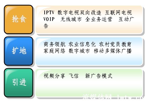 從廣義上講,廣電、電信、互聯(lián)網(wǎng)都屬于信息行業(yè),現(xiàn)在都面臨著自己在增長(zhǎng)中遇到的問(wèn)題,也就是滯漲。滯漲逼迫大家必須去轉(zhuǎn)型,轉(zhuǎn)型現(xiàn)在有三種方式,一個(gè)是搶,一個(gè)是擴(kuò),一個(gè)是引進(jìn)。從最近會(huì)議上來(lái)看,目前大家對(duì)搶食比較感興趣,畢竟有現(xiàn)成的一碗紅燒肉已經(jīng)做好了,對(duì)后面兩個(gè),相對(duì)來(lái)說(shuō)談得還比較少,因?yàn)楹竺鎯蓚(gè),需要引入一些創(chuàng)新的技術(shù),引入創(chuàng)新的思維。
