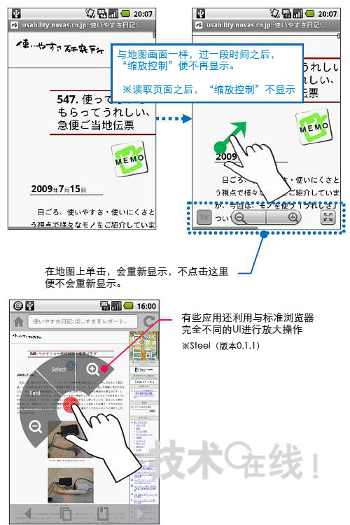 圖片說明: 利用不同操作調(diào)出同一工具為在Android的標(biāo)準(zhǔn)瀏覽器(上面的兩個(gè)畫面)上調(diào)出縮放畫面顯示的工具(縮放控制),用手指拖拽畫面(向一個(gè)方面滑動(dòng))。為利用地圖應(yīng)用軟件調(diào)出同一工具,需要輕敲畫面(敲擊)能從在Android市場(chǎng)上下載的瀏覽器(下面的畫面)有能夠利用完全不同的UI縮放畫面的工具。