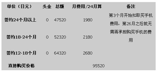 我們都知道日本的購買手機(jī)最主要是和運(yùn)營商簽約購買,我們以夏普2009年夏季最新款手機(jī)Soft Bank 933SH為例,來說明一下在日本購買手機(jī)的成本?偟膩碚f,就是簽約時(shí)間越長,購買手機(jī)價(jià)格越低,簽約時(shí)間越短,購買價(jià)格越高。