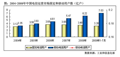 圖: 2004-2009年中國(guó)電信運(yùn)營(yíng)市場(chǎng)固定和移動(dòng)用戶數(shù)