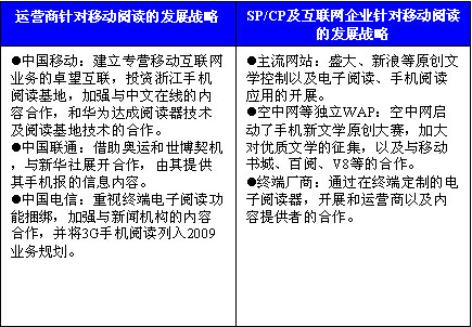 隨著3G的啟動(dòng),越來(lái)越多的傳統(tǒng)互聯(lián)網(wǎng)巨頭、運(yùn)營(yíng)商、手機(jī)廠商等紛紛介入無(wú)線互聯(lián)網(wǎng)領(lǐng)域,而更多的新興企業(yè)也加入到競(jìng)爭(zhēng)中來(lái)。從目前市場(chǎng)的發(fā)展情況來(lái)看,運(yùn)營(yíng)商由于其依托的用戶資源以及對(duì)網(wǎng)絡(luò)資源的控制,在移動(dòng)閱讀產(chǎn)業(yè)中占據(jù)了優(yōu)先的主動(dòng)權(quán),然而針對(duì)移動(dòng)閱讀,其內(nèi)容資源環(huán)節(jié)稍顯薄弱,傳統(tǒng)電子書產(chǎn)品資源豐富然而涉及版權(quán)問題,不能大規(guī)模應(yīng)用于移動(dòng)領(lǐng)域,因此優(yōu)質(zhì)的內(nèi)容將是移動(dòng)閱讀產(chǎn)業(yè)發(fā)展的核心競(jìng)爭(zhēng)優(yōu)勢(shì)。針對(duì)此,運(yùn)營(yíng)商也相應(yīng)加大了對(duì)優(yōu)質(zhì)內(nèi)容的挖掘和控制。以中國(guó)移動(dòng)為例,于2009年3月和浙江省人民政府代表簽署了長(zhǎng)期戰(zhàn)略合作協(xié)議,并將在兩年內(nèi)投入5000萬(wàn)元,支持浙江手機(jī)閱讀基地的建設(shè)。
