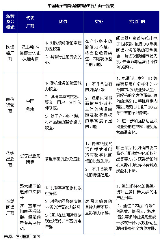 International)分析認(rèn)為,目前中國電子書市場以閱讀器廠商及電信運(yùn)營商兩種力量為主導(dǎo),此外還包括傳統(tǒng)出版商、在線閱讀廠商等其他力量。對現(xiàn)有各種運(yùn)營模式的企業(yè)分析如下: